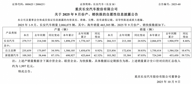 据刚公布的2025年第三季度财报显示,长安汽车经营规模稳健增长,产品结构持续优化,经营质量稳健向好。长安汽车三季度实现营业收入422.36亿元,同比增长23.36%;归母净利润7.64亿元,同比增长2.13%;扣非后净利润5.42亿元,同比增长5.77%。前三季度整车销量达206.6万辆,同比增长8.46%,其中新能源汽车销量72.4万辆,同比增长59.72%;海外销量46.5万辆,同比增长10.7%,均创历史新高,展现出强劲攀升势头。整体来看,长安汽车实现“量价利”齐升态势,转型阶段性成果显现,正步入高质量发展收获期。